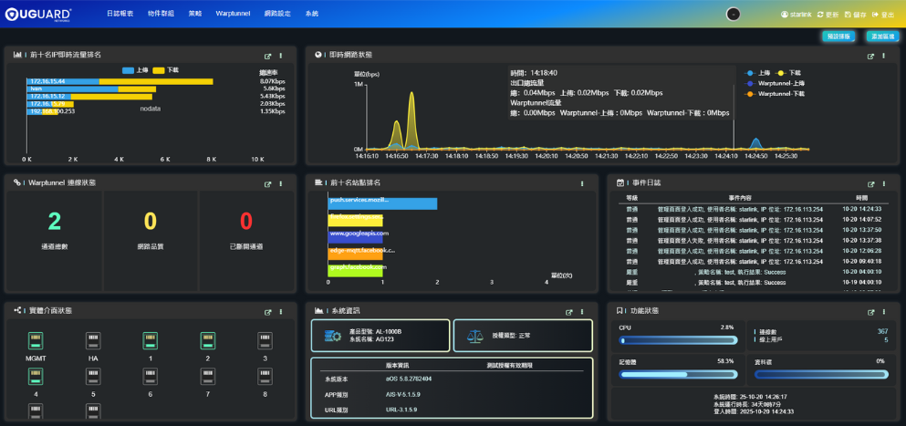 UI畫面「AgileLink新世代廣域網路管理」:提供多項重要即時資訊,快速掌握設備、系統、網路狀態。